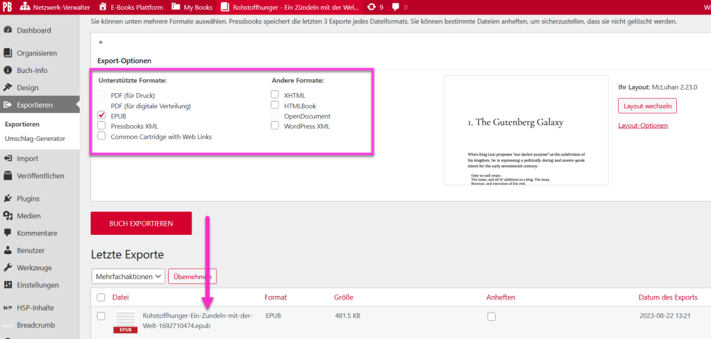 Via Menu – Exportieren aktivieren Sie die gewünschten Formate und klicken auf «Buch exportieren». Danach werden die Ausgabe-Formate im Bereich «Letze Exporte» aufgelistet, sowie – falls eingestellt – auch auf der Frontseite zum Download bereitgestellt.